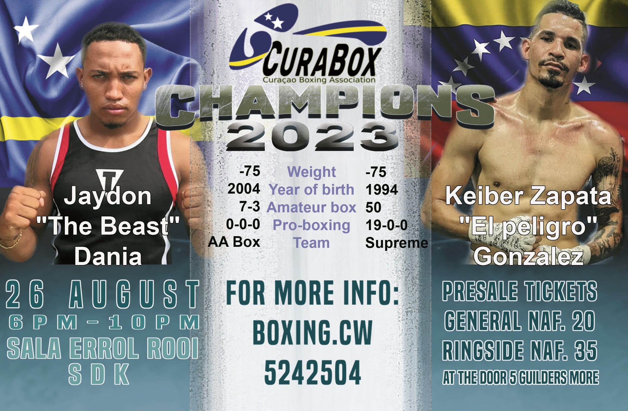 Presale; General Naf. 20,- and Ringside Naf. 35,-