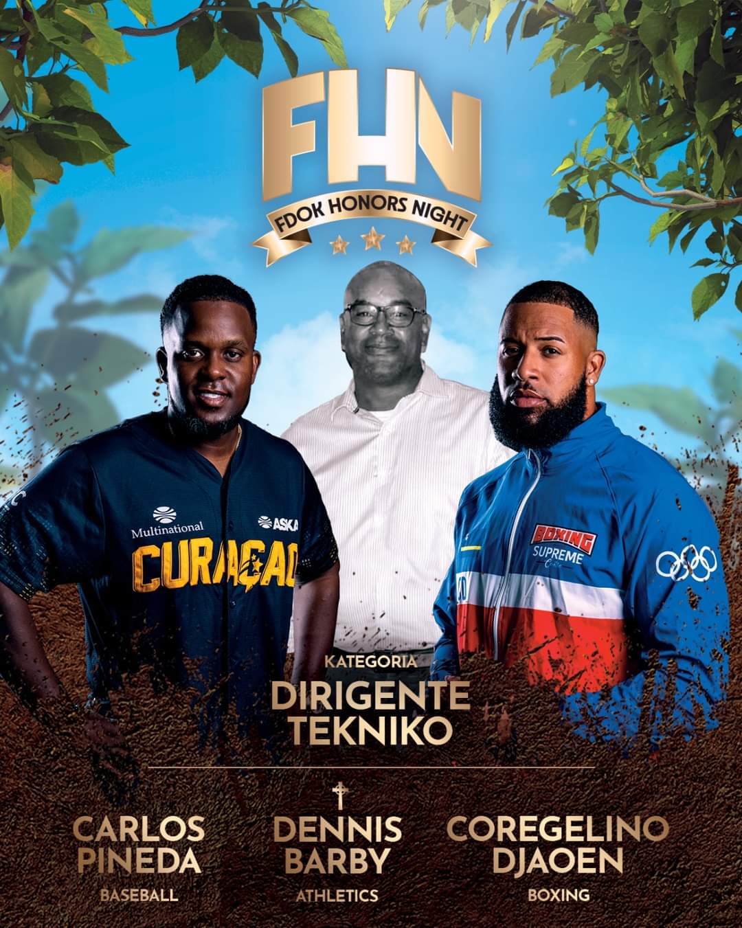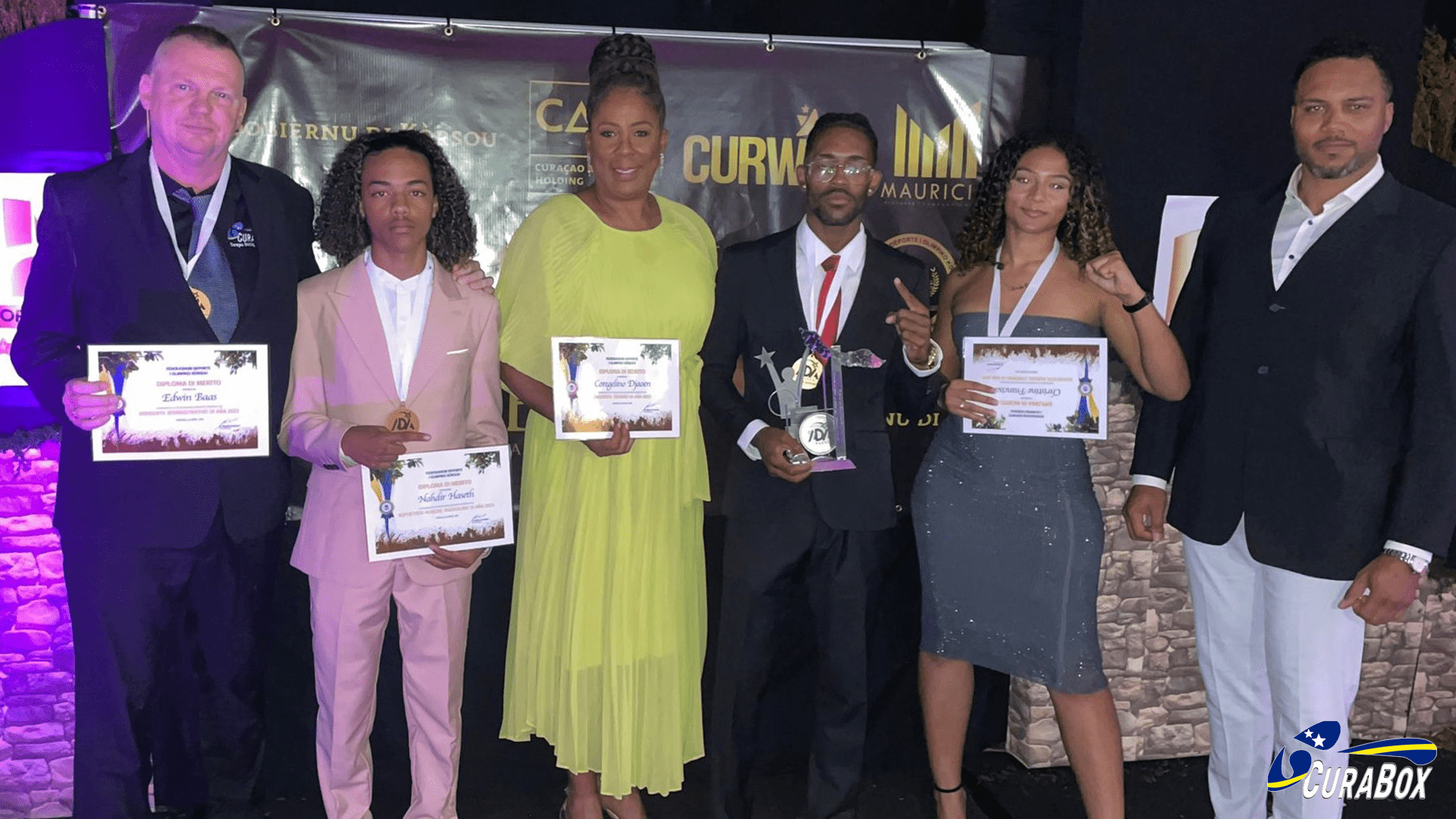 The following people from the boxing sport were nominated by FDOK (Federashon Deporte i Olímpiko Kòrsou). In the photo below from left to right; Edwin Baas (Dirigente Atministrativo), Nahdir Haseth (Deportista Hubenil Maskulino), Coregelino Djaoen (Dirigente Tékniko) who because he was abroad was represented by his mother Corine Djaoen Genaro, Fabian Williams (Deportista Senior Maskulino), Christine Francisca (Deportista Hubenil Femenino) and also in the photo at the right Len Huard, president of the NBB (Boxing federation of The Netherlands).