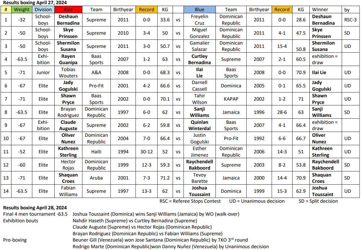 April 27 and 28, 2024, Supreme Boxing Centre Curaçao organized for the 4th time an international boxing event with amateur bouts, under supervision of the Curaçao Boxing Association (CuraBox), and also 2 pro fights with participation of (in alphabetic order); Aruba, Curacao, Dominica, Dominican Republic, Haiti, Jamaica and Venezuela.
